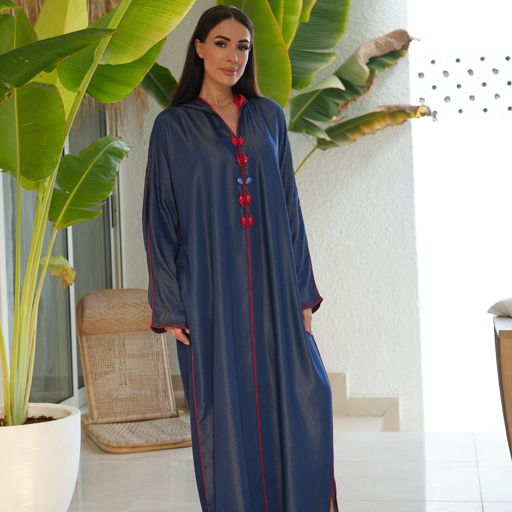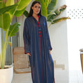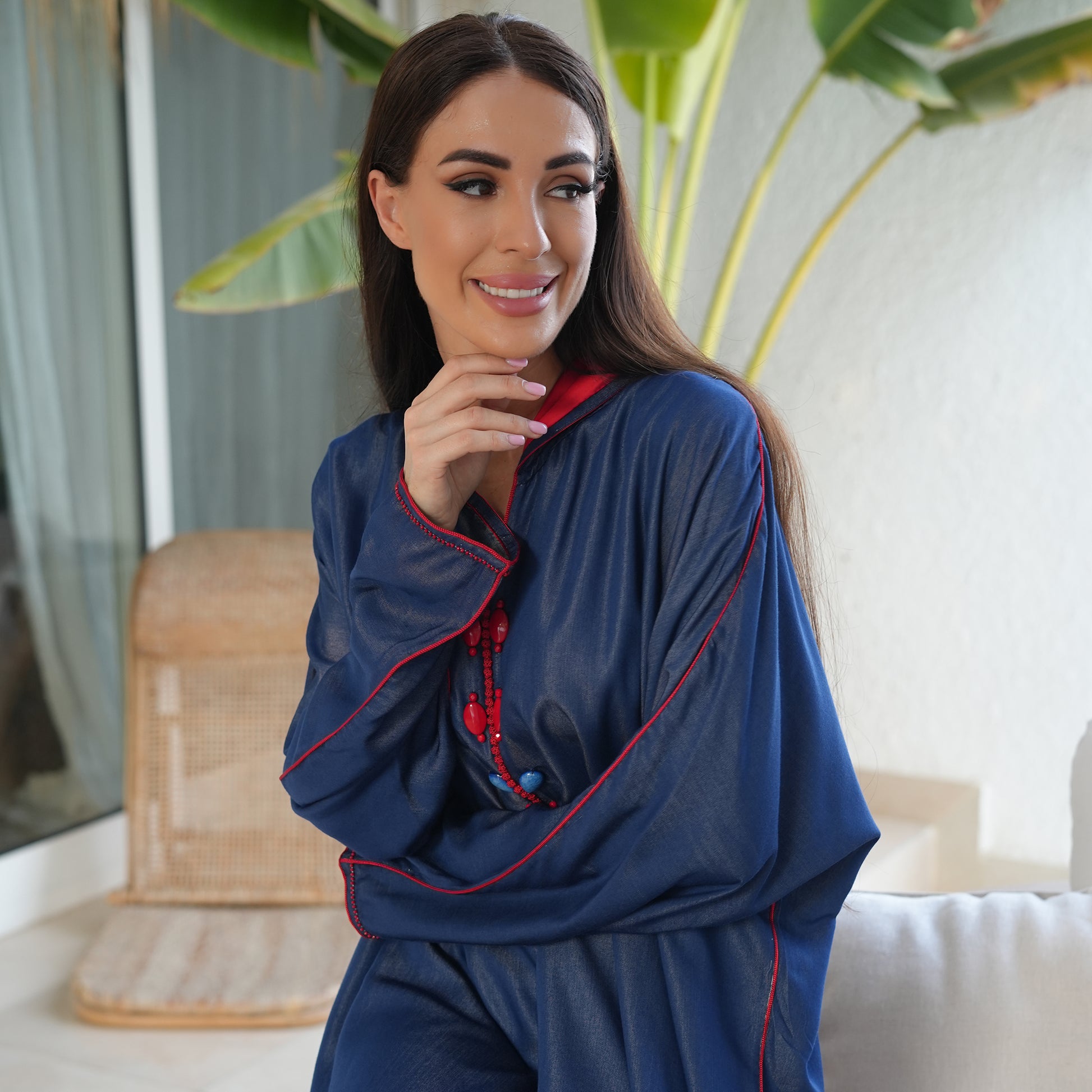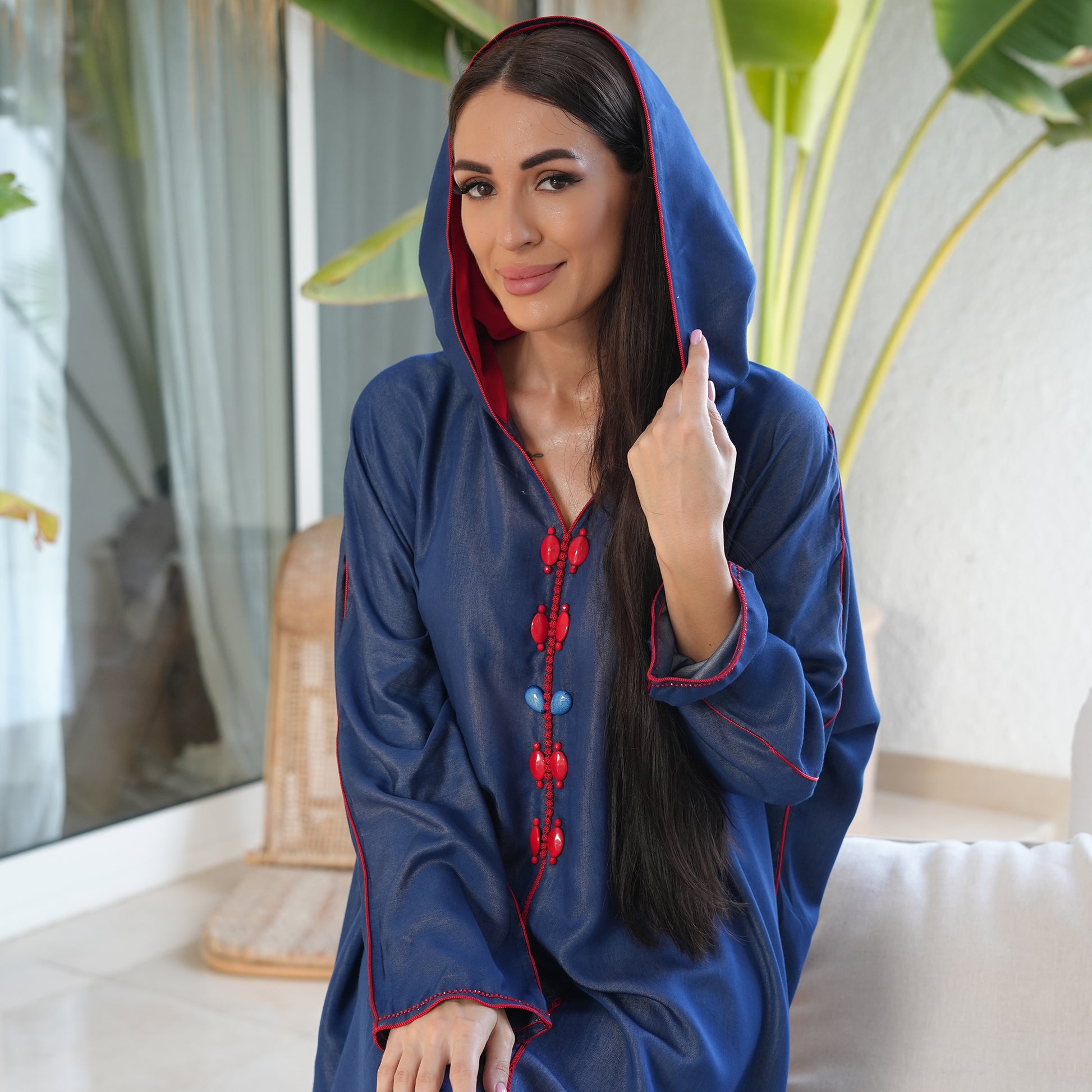 Introducing the Djellaba Jean's, a masterpiece by renowned designer BOUCHRA FILALI LAHLOU, handcrafted in Casablanca, Morocco. This exquisite garment seamlessly combines Moroccan tradition with modern elegance, offering a unique style that celebrates heritage and individuality. A lightweight, fashionable Djellaba that can be worn every day, for gatherings, or even gifted to your beloved one.