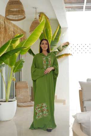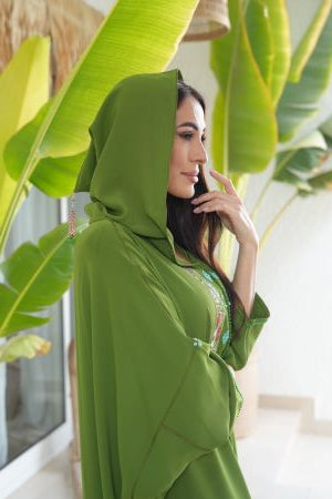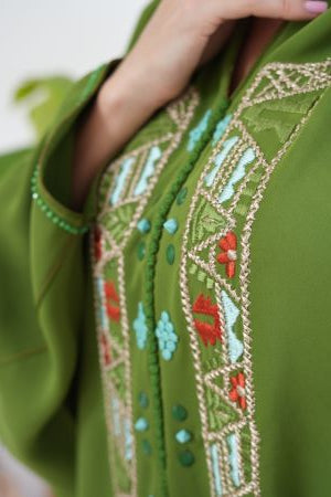 Introducing the "Vert Anis Djellaba," a masterpiece crafted in Morocco by skilled artisans. This gown is the epitome of elegance and uniqueness, a perfect addition to your bridal collection. With its vibrant green hue and intricate design, it exudes a sense of confidence and beauty. Walk with pride, knowing you're adorned in an exclusive creation tailored exclusively for Mimosa Concept Store.