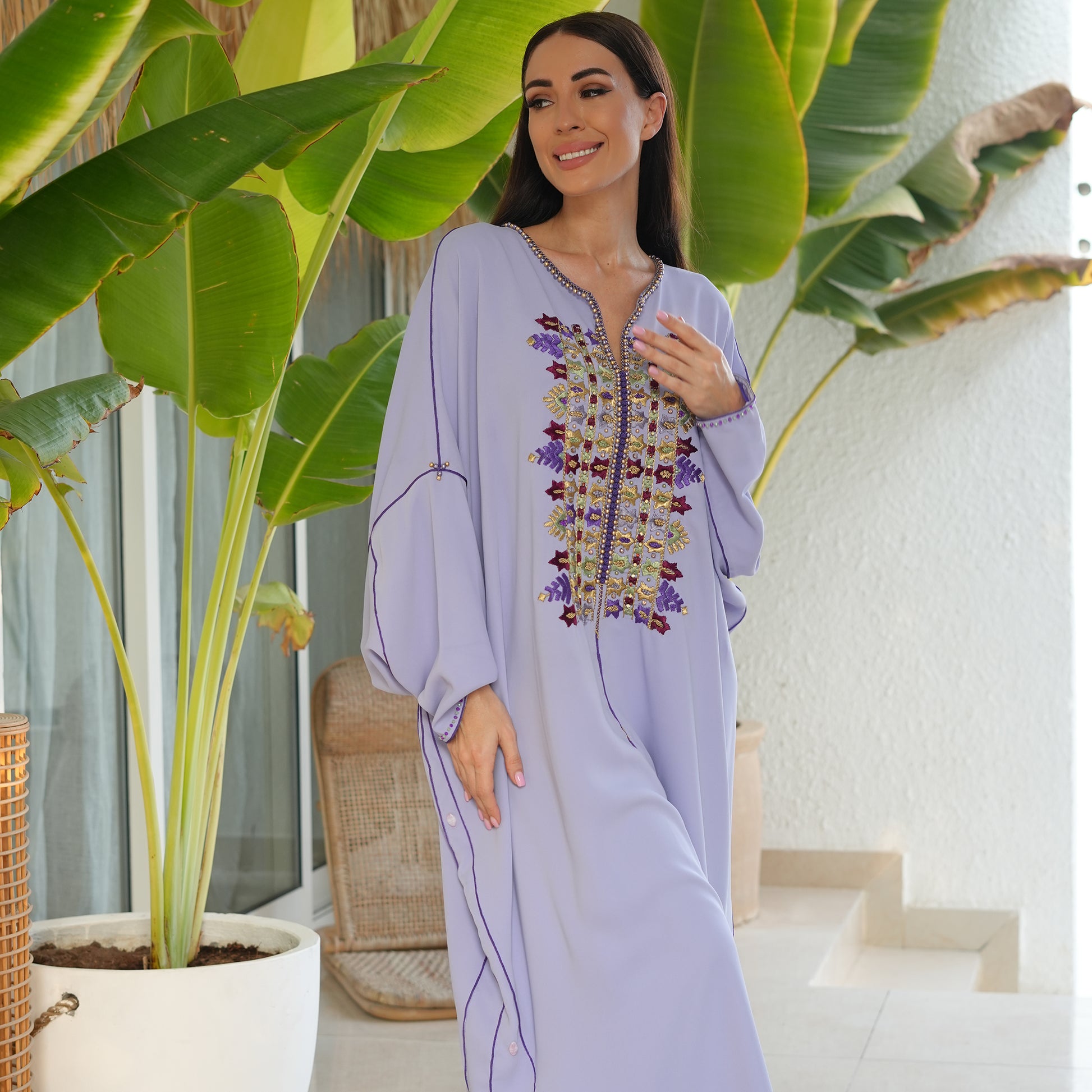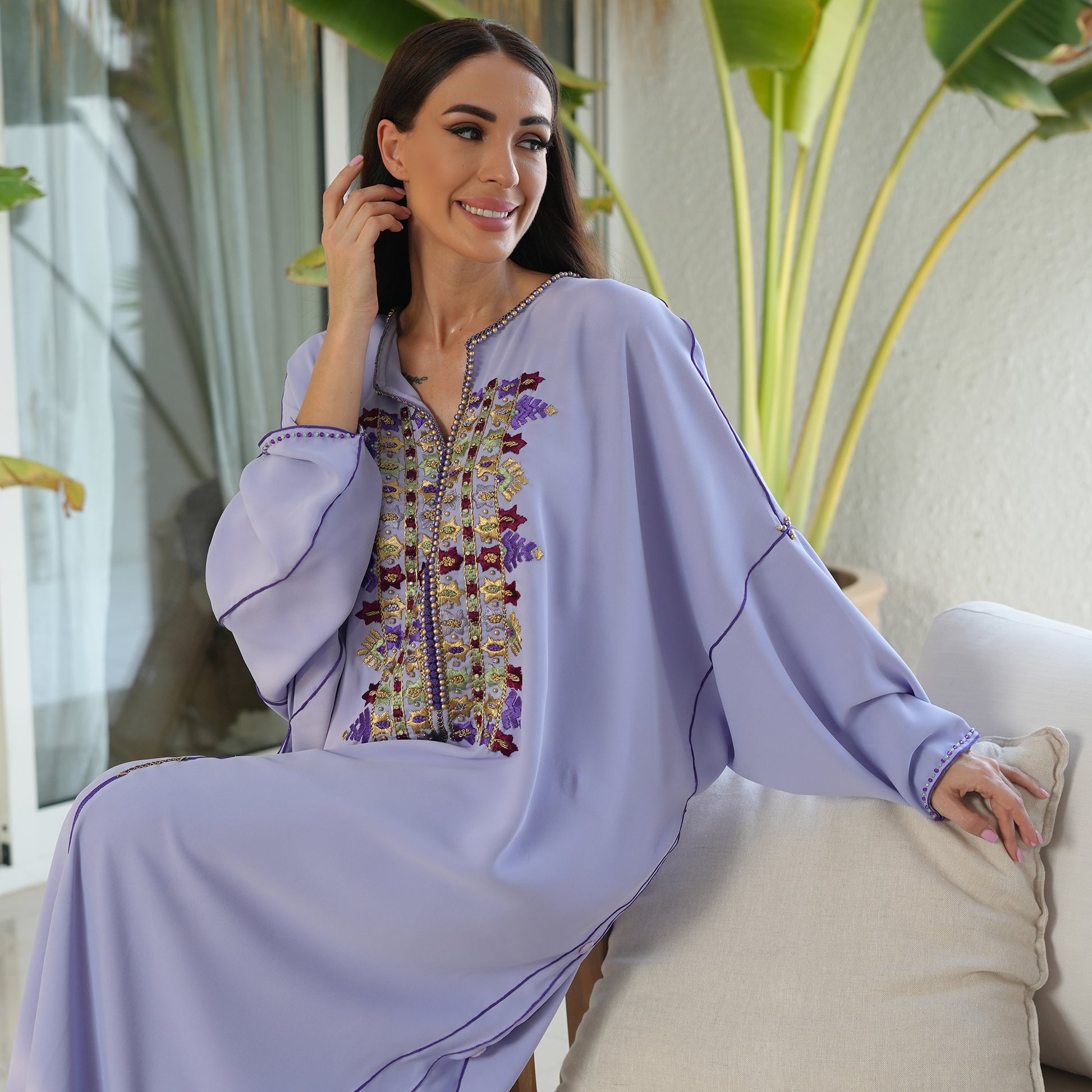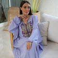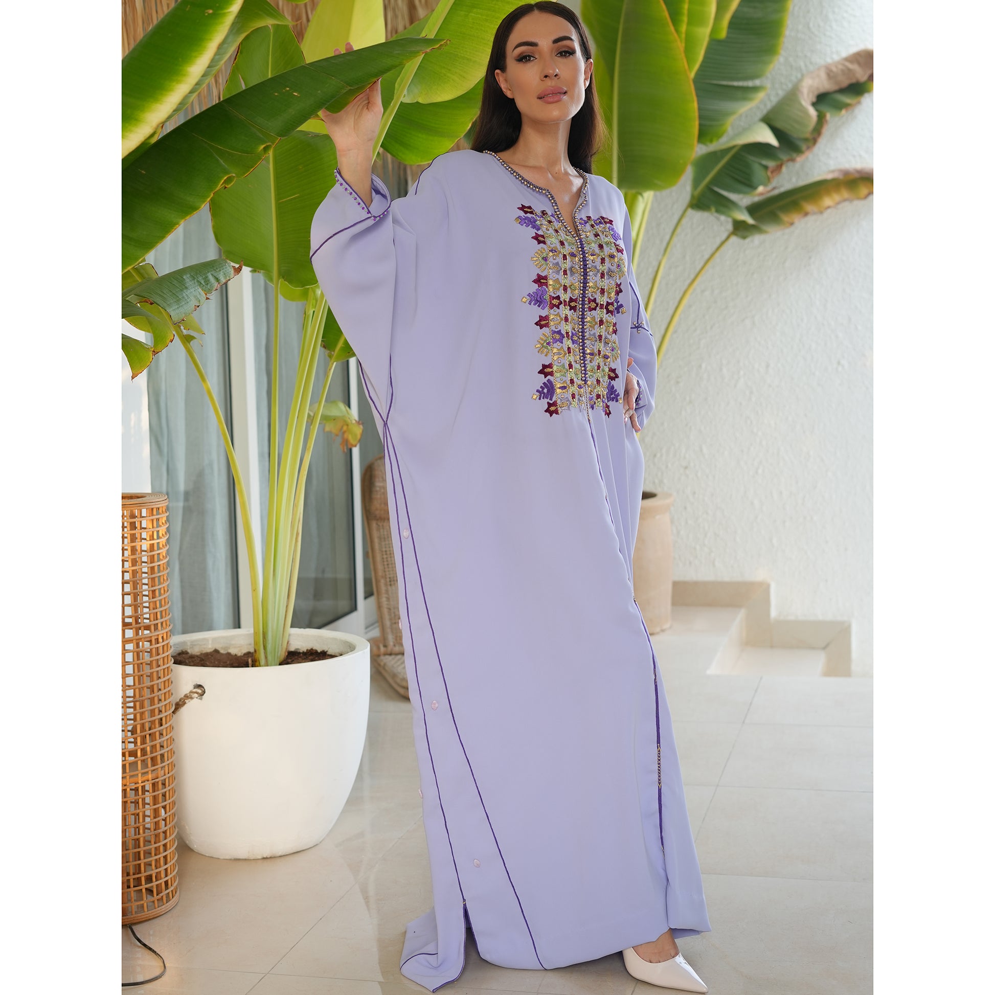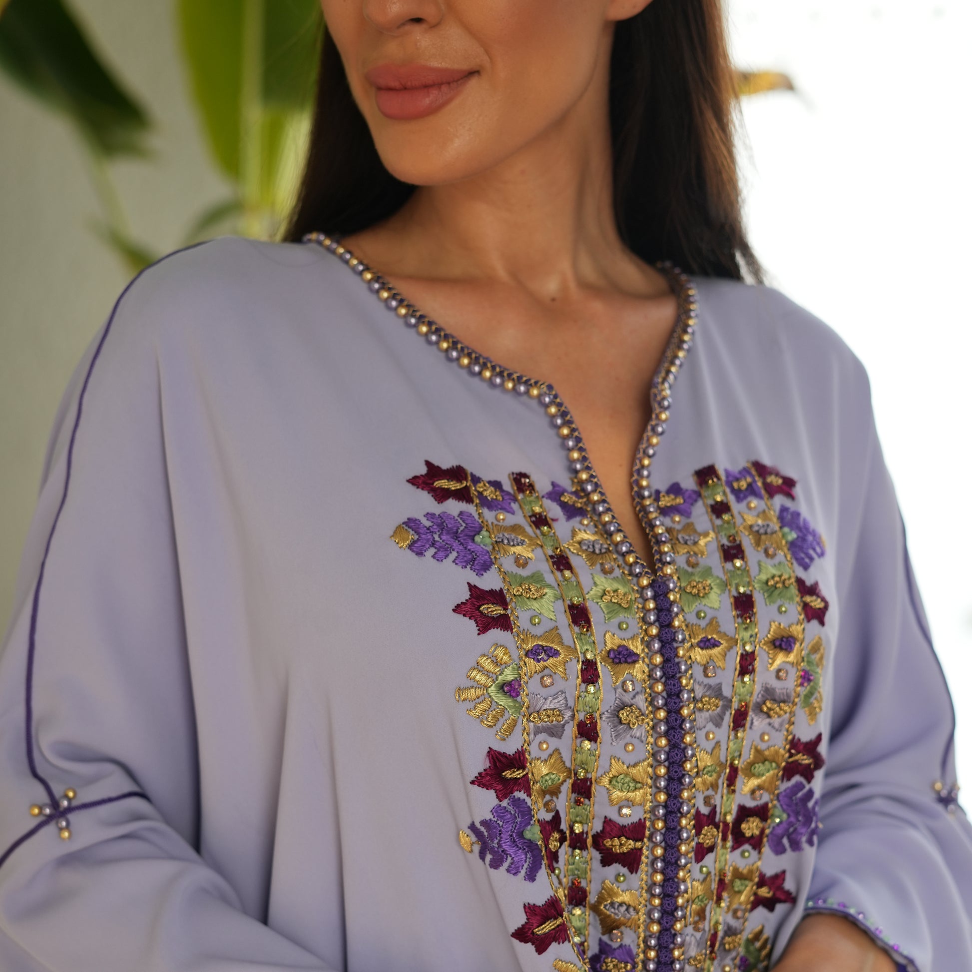 Introducing Djellaba Violet, a masterpiece by the Moroccan designer Bouchra Filali Lahlou, meticulously handcrafted by artisans from Morocco. These special pieces are more than just garments; they are exquisite creations perfect for special events, gatherings, or as cherished gifts for your beloved bride. Elevate your style and embrace Moroccan heritage with Djellaba Violet, a symbol of sophistication and grace