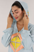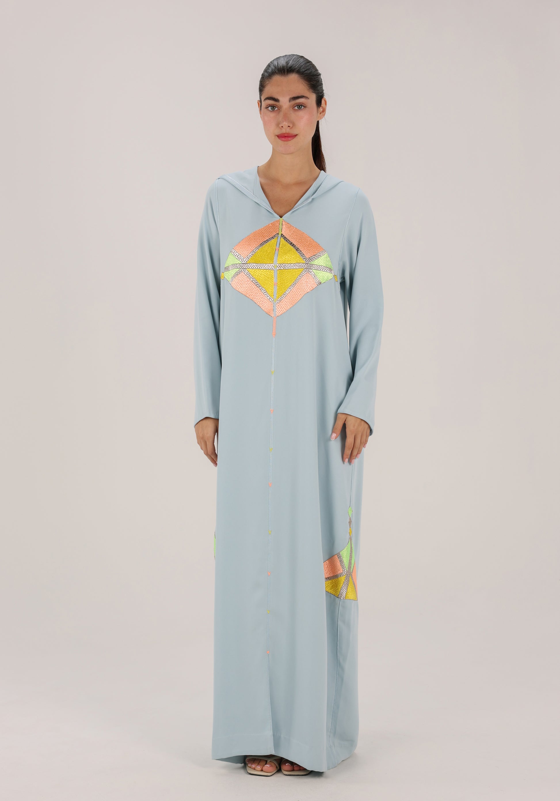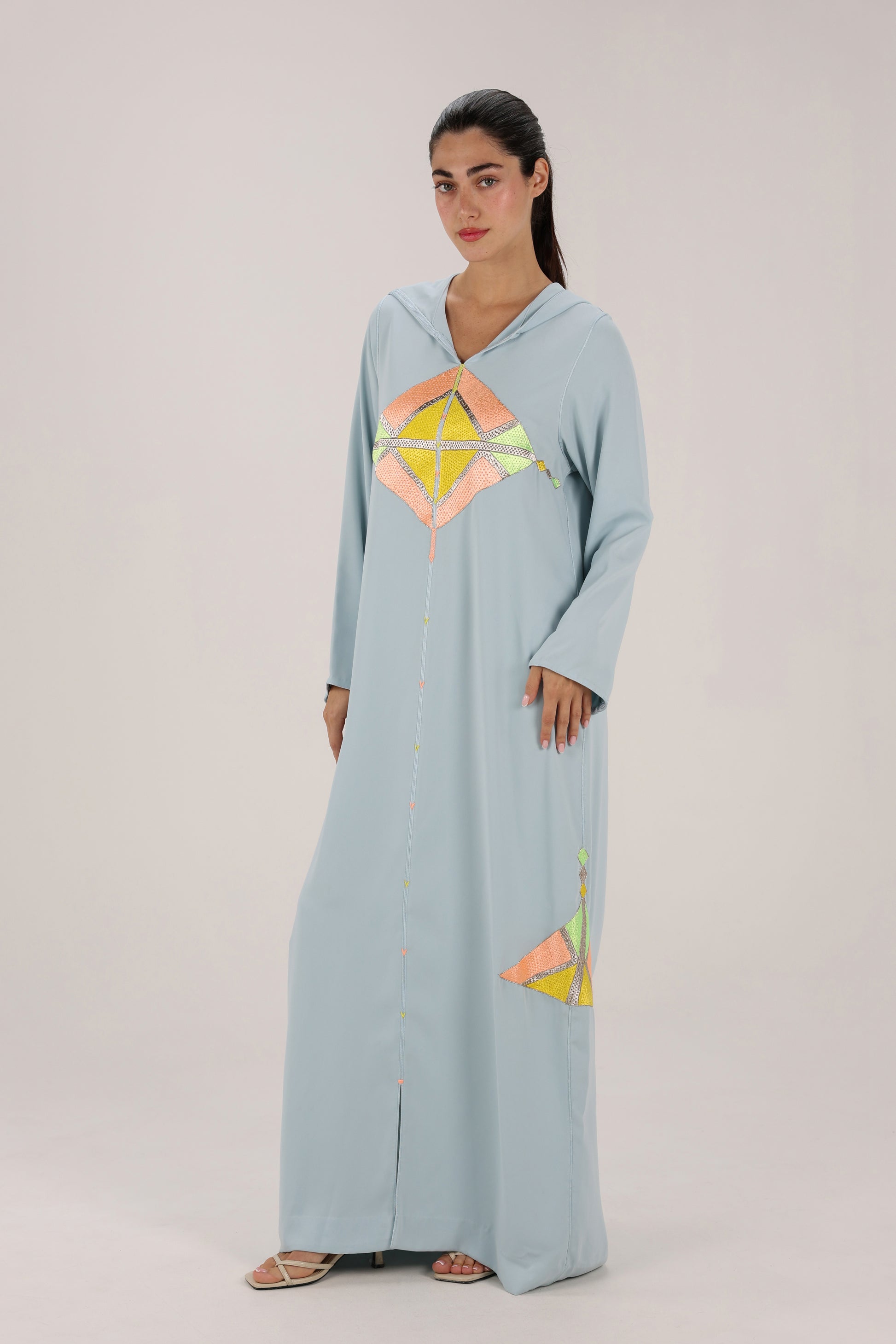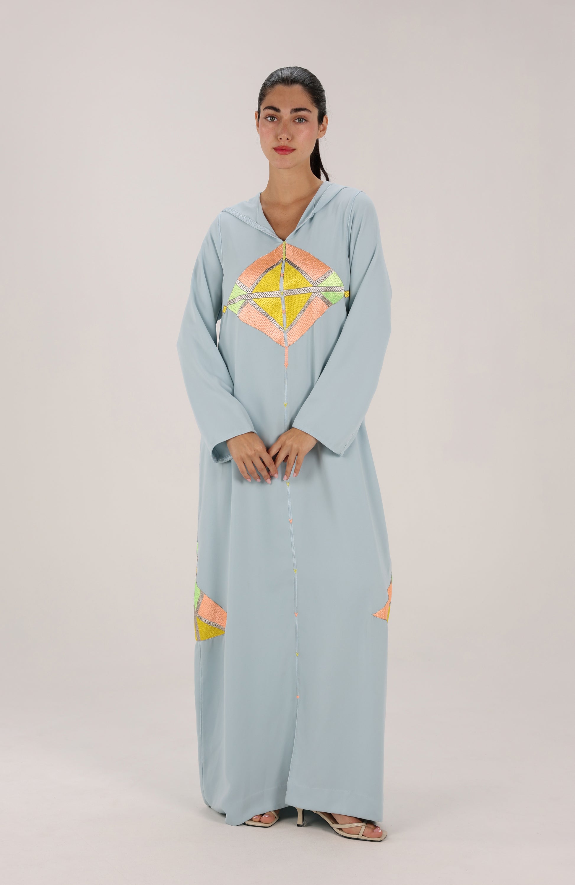This contemporary Moroccan kaftan is crafted in a soft powder blue fabric, elevated with vibrant geometric embroidery inspired by traditional Moroccan motifs. The front panel features hand-embroidered detailing in warm tones of peach, yellow, and soft green, creating a striking yet balanced contrast.