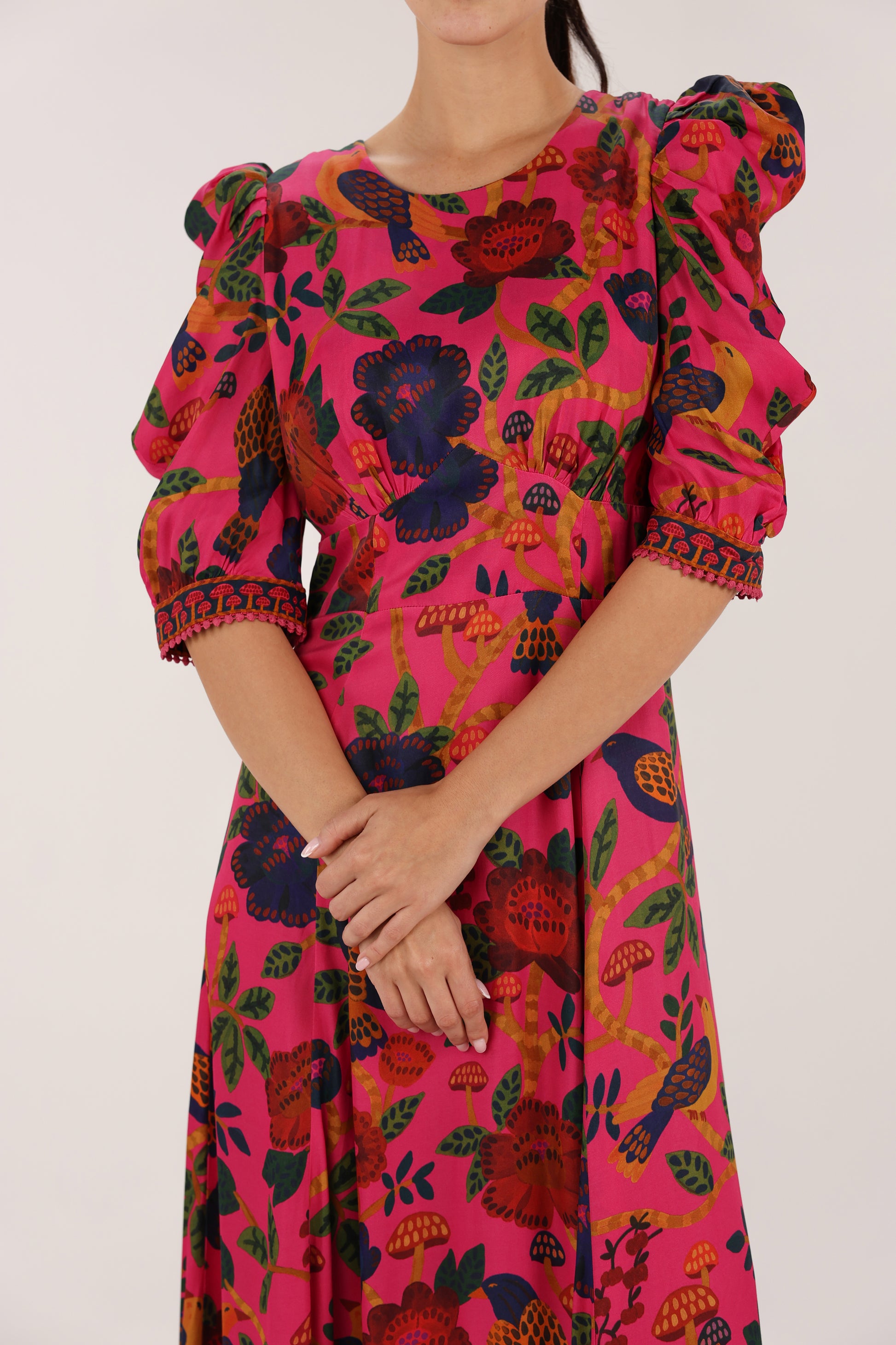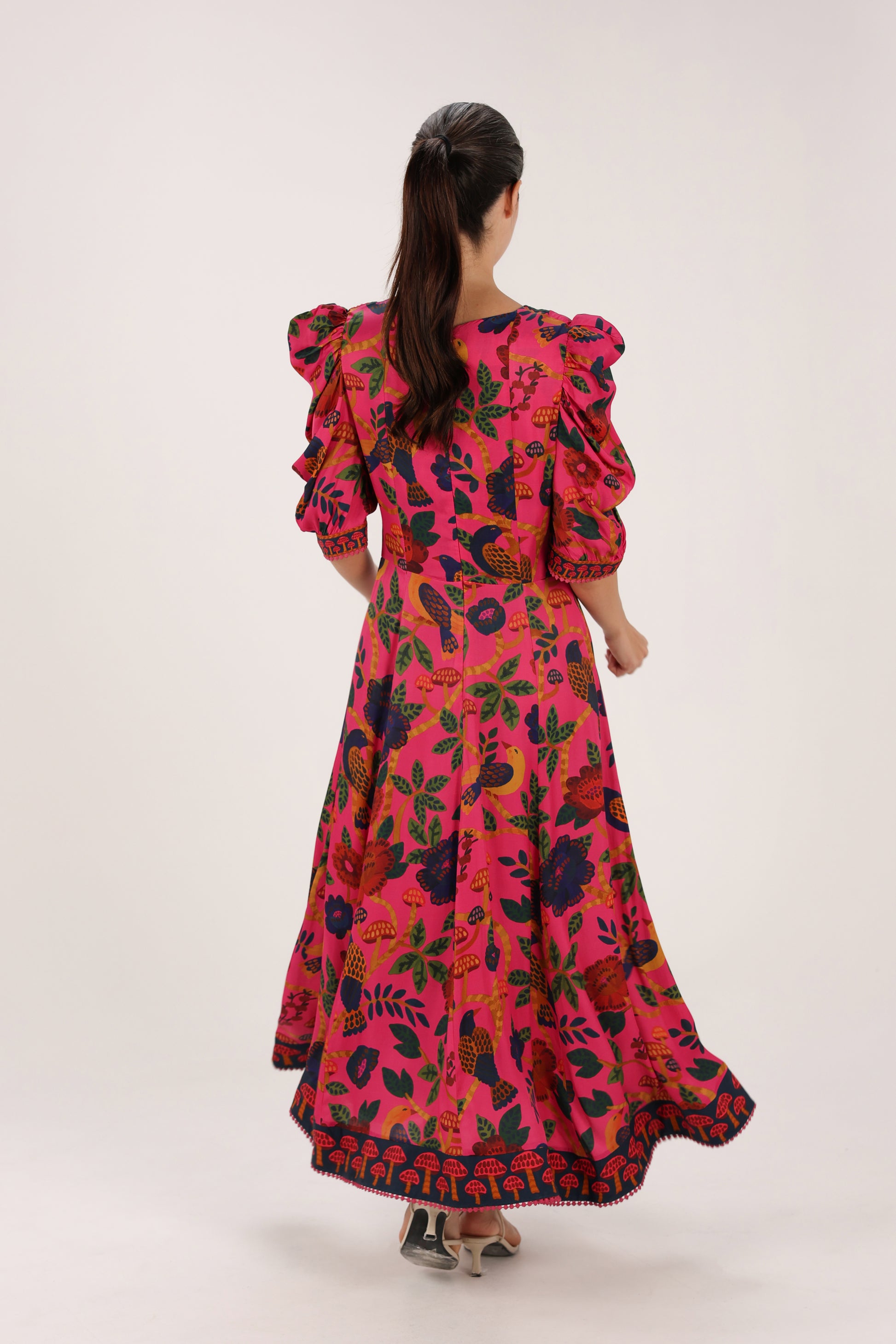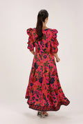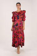 From FARM RIO, this vibrant midi dress features a playful floral print and a flattering silhouette with soft volume through the sleeves. A joyful statement piece, perfect for daytime gatherings or effortless evening styling.
