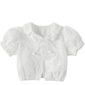 - Details: Balloon sleeves, small satin bows on the front, elasticated legs, button opening at the back.