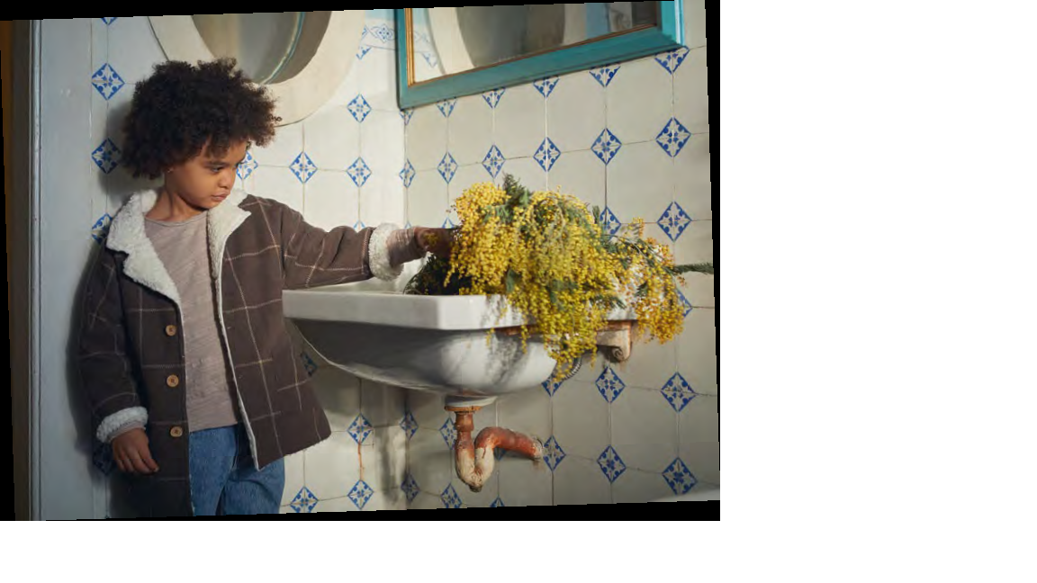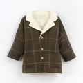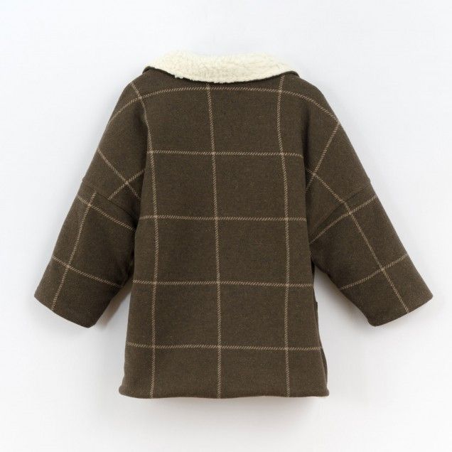This jersey-stitch jacket is made of a mixture of recycled polyester and recycled cotton, Brownie colour. The model has a collar, organic cotton fur lining, front opening with coconut buttons and front pockets.