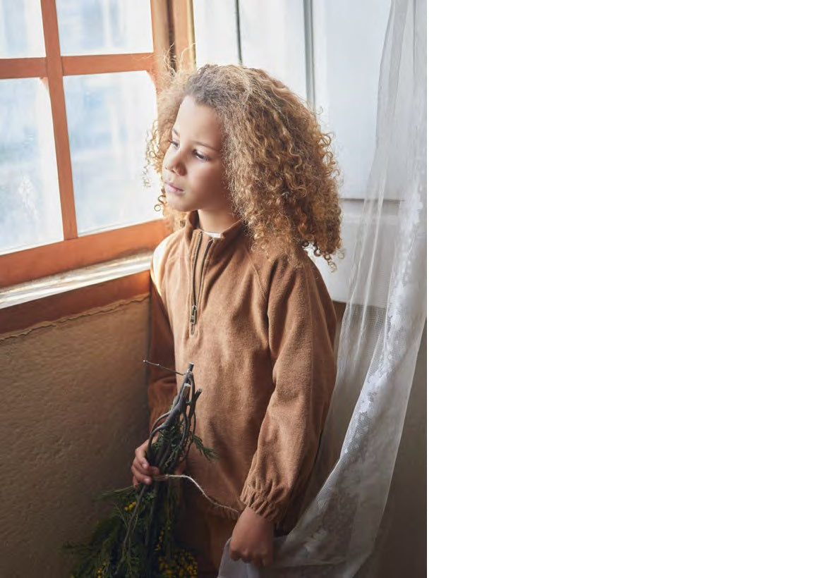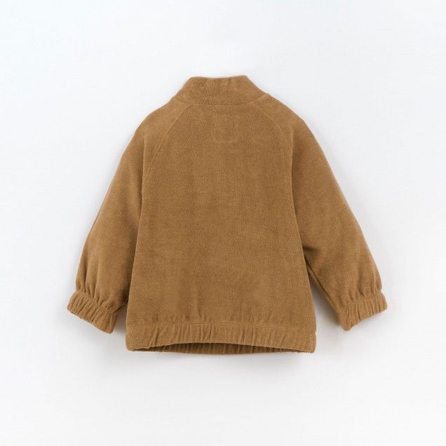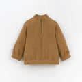 This jersey-stitch jersey is made of a mixture of organic cotton and recycled cotton, Cocoa colour. The model has a high collar and a front zip, elastic details on the cuffs and hem. All the raw materials used in this piece have Standard 100 Certification by OEKO-TEX - which makes it free of substances which are harmful to children´s skin. 50.0% Organic Cotton,50.0% Recycled Cotton