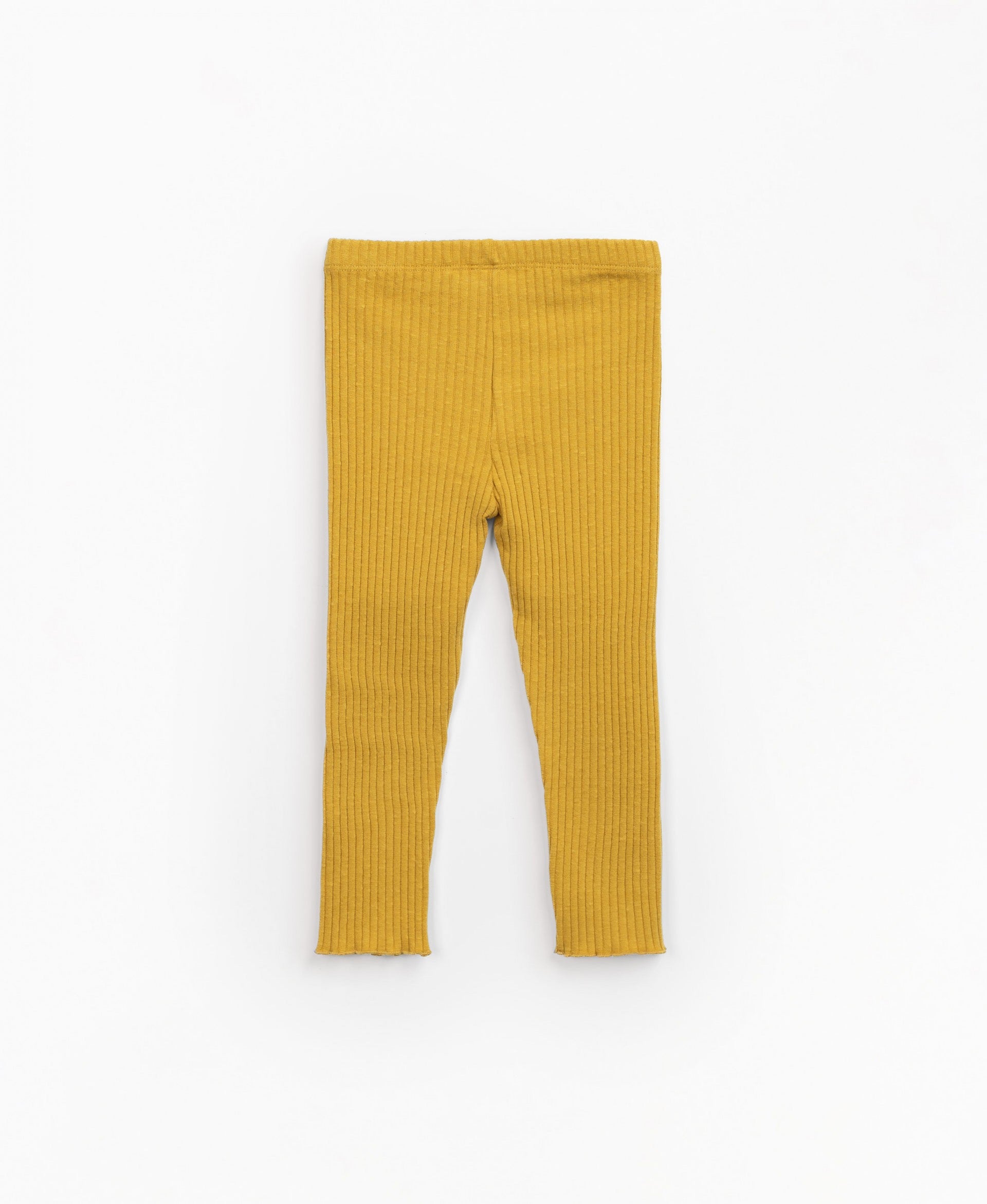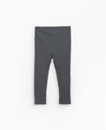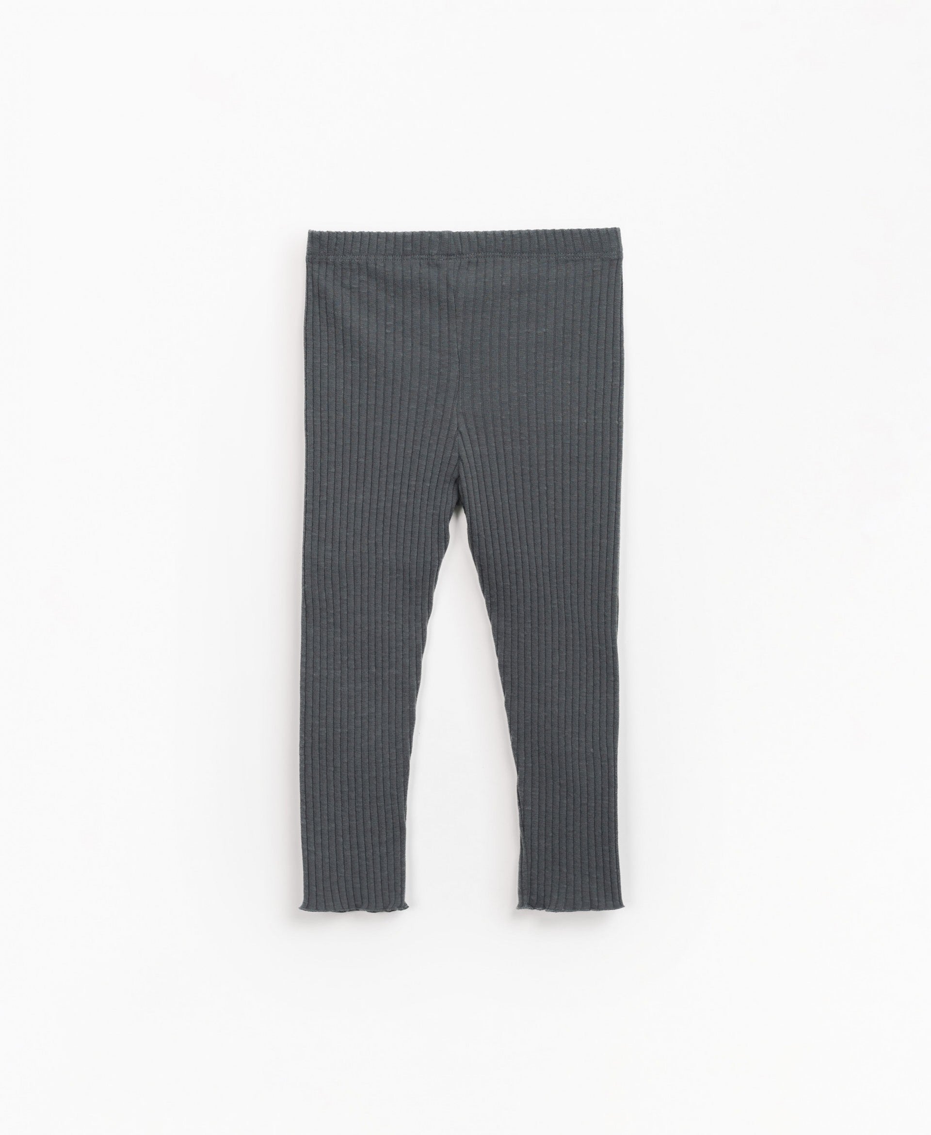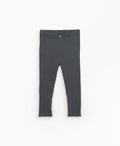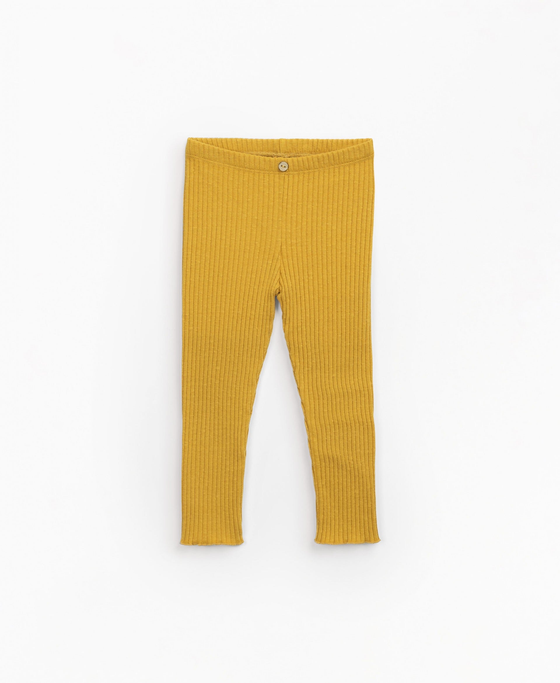 These jersey knit ribbed leggings are made of a mixture of recycled cotton, recycled polyester, cotton and polyester, Bruno colour. The model has an elastic waist and a decorative coconut button.