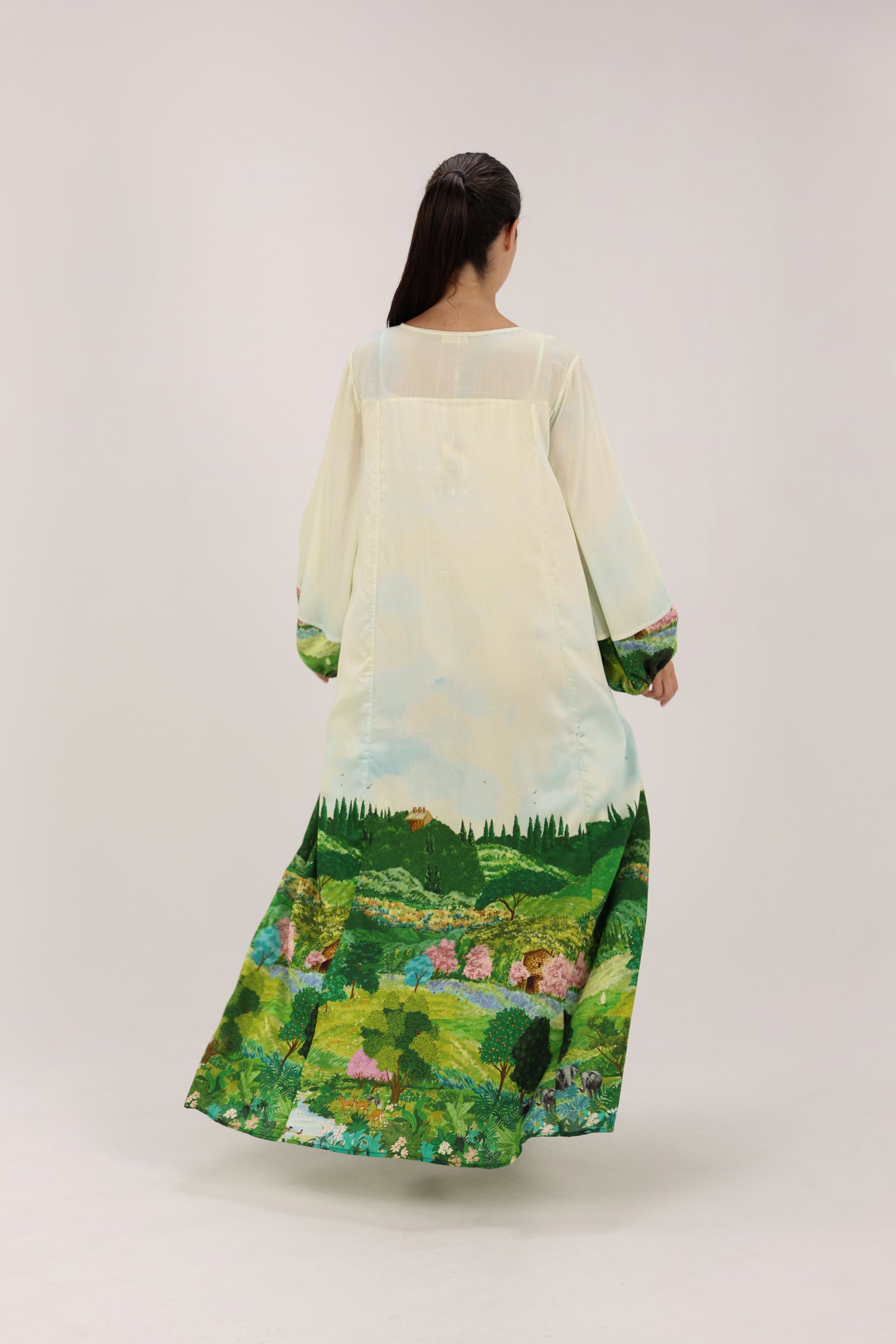 Design details: Hand-illustrated landscape print with gathered cuffs and airy movement