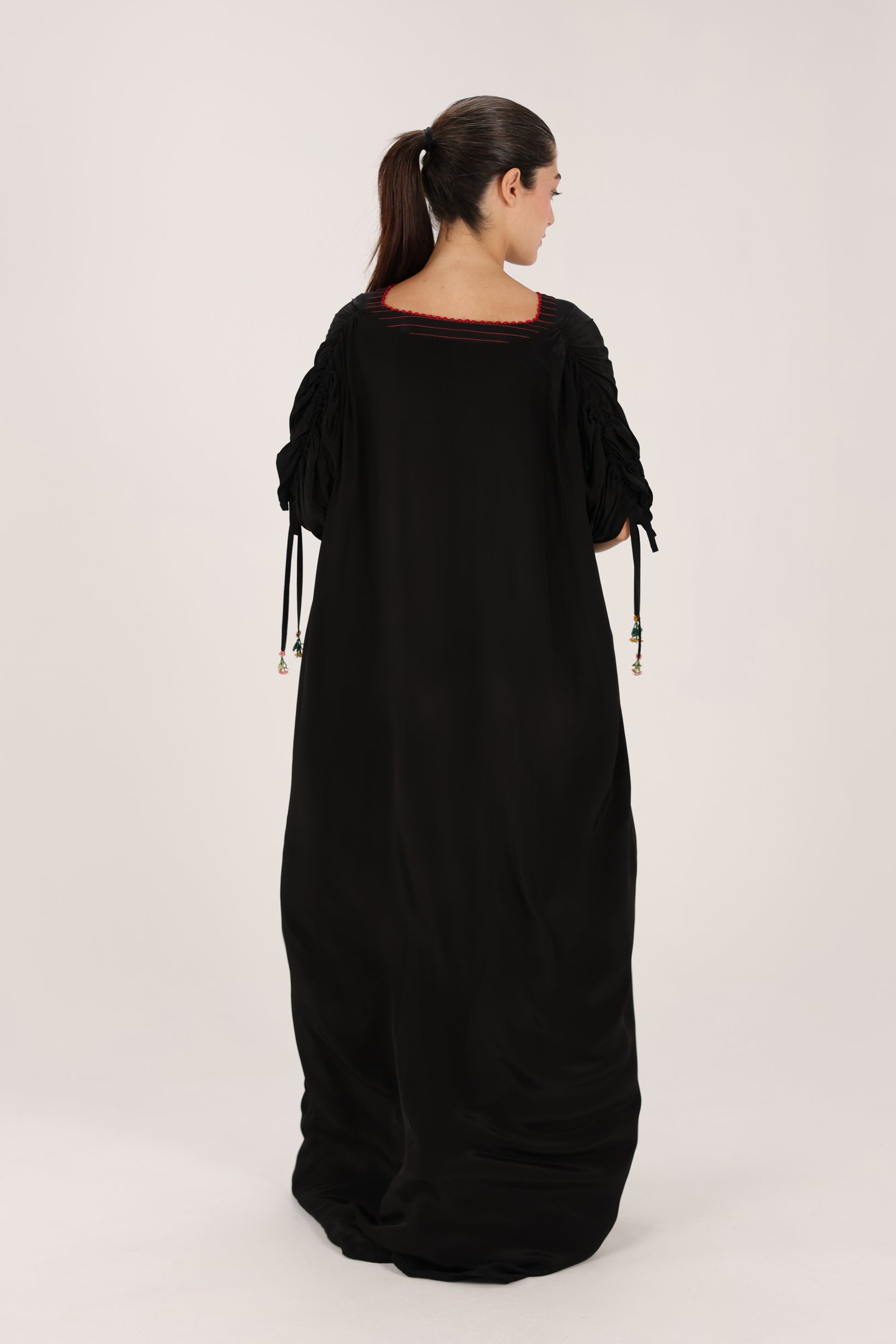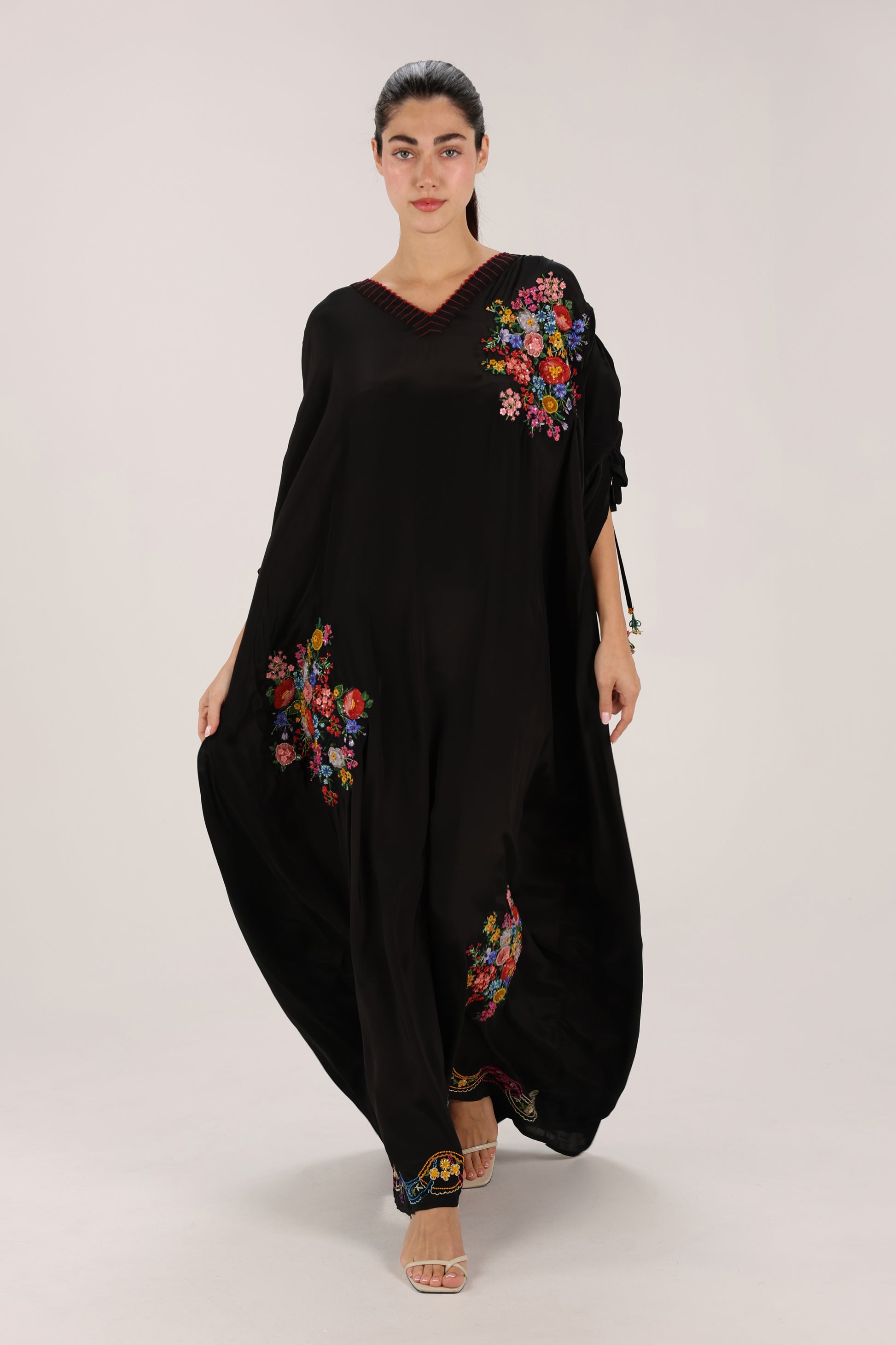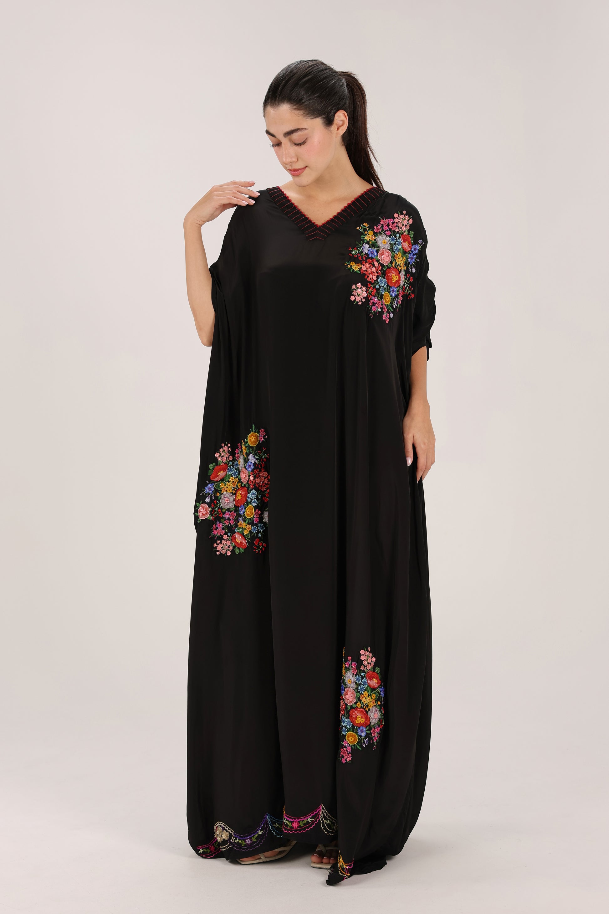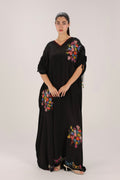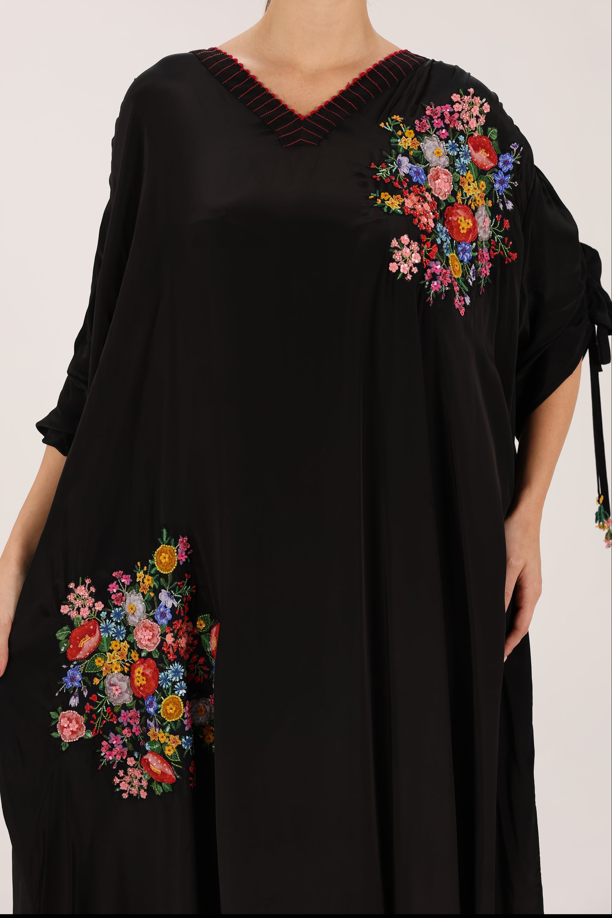 Handmade in India, this flowing black dress features delicate floral embroidery placed thoughtfully across the silhouette. Effortless, graceful, and designed to make a quiet statement.