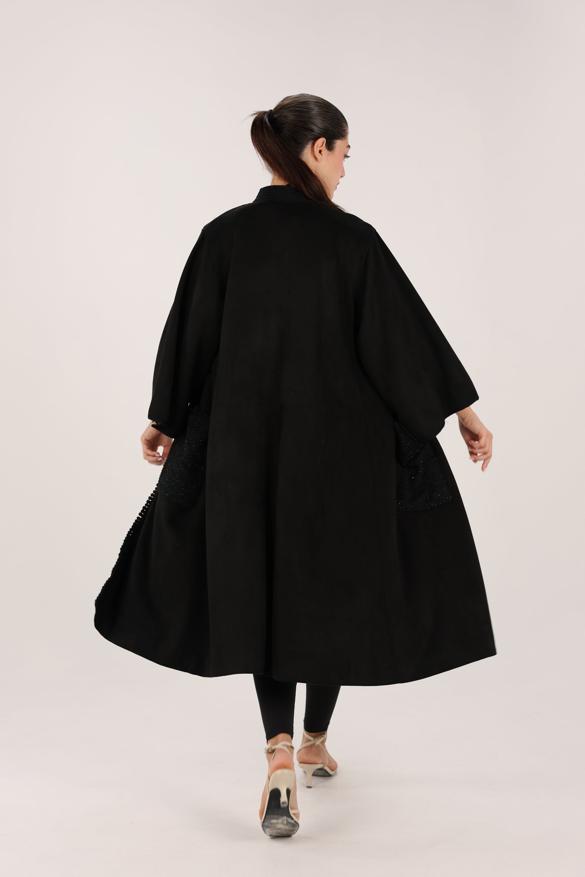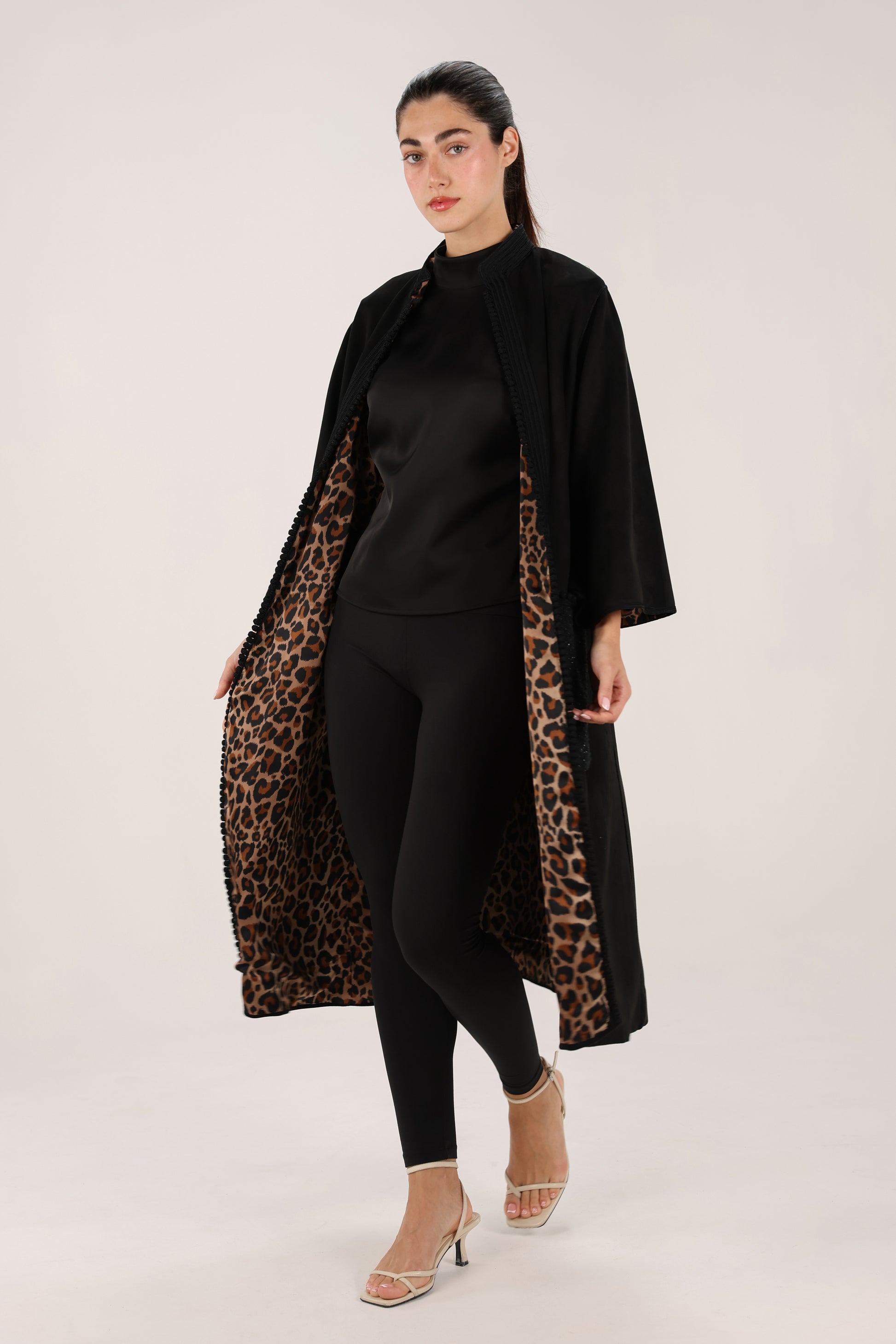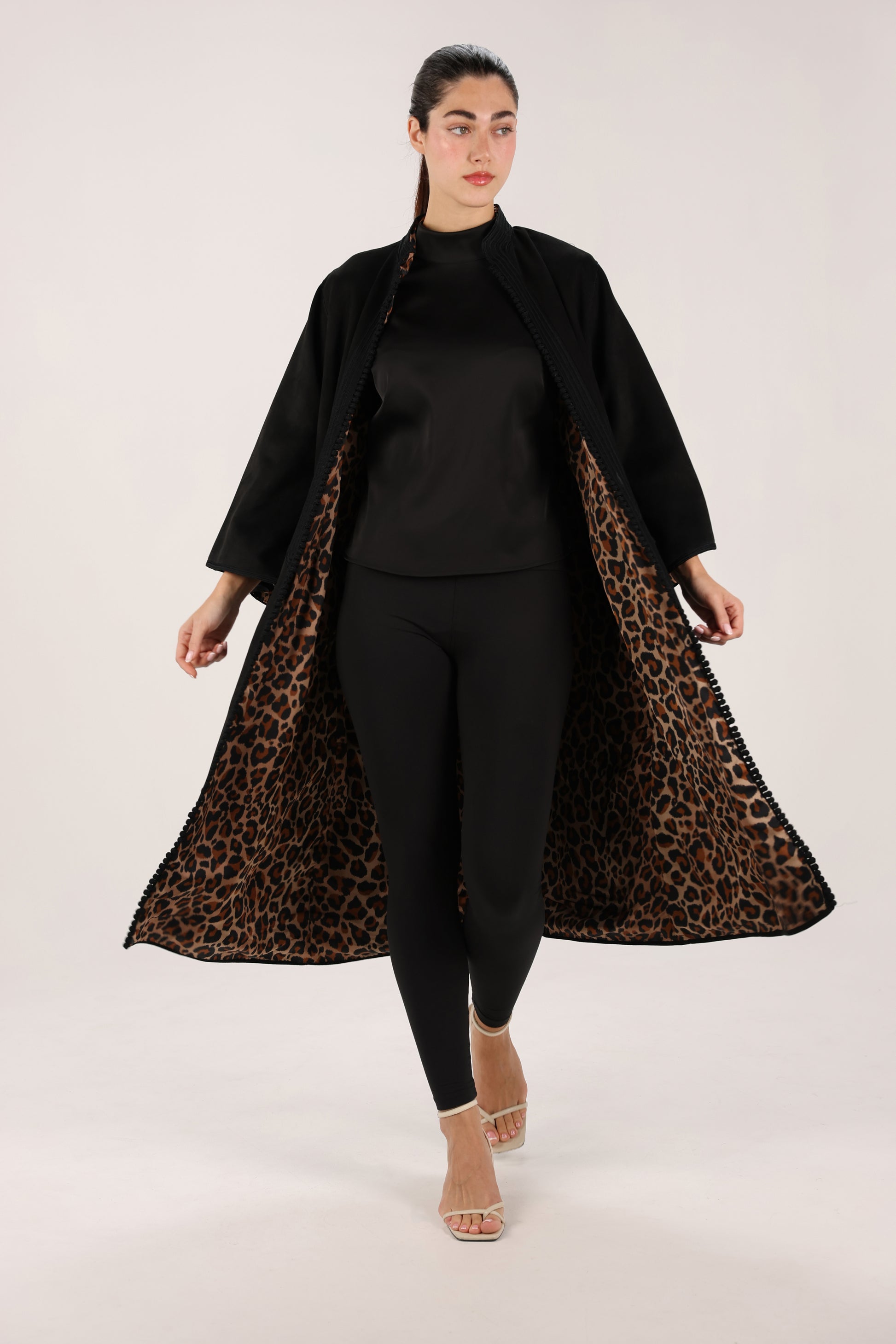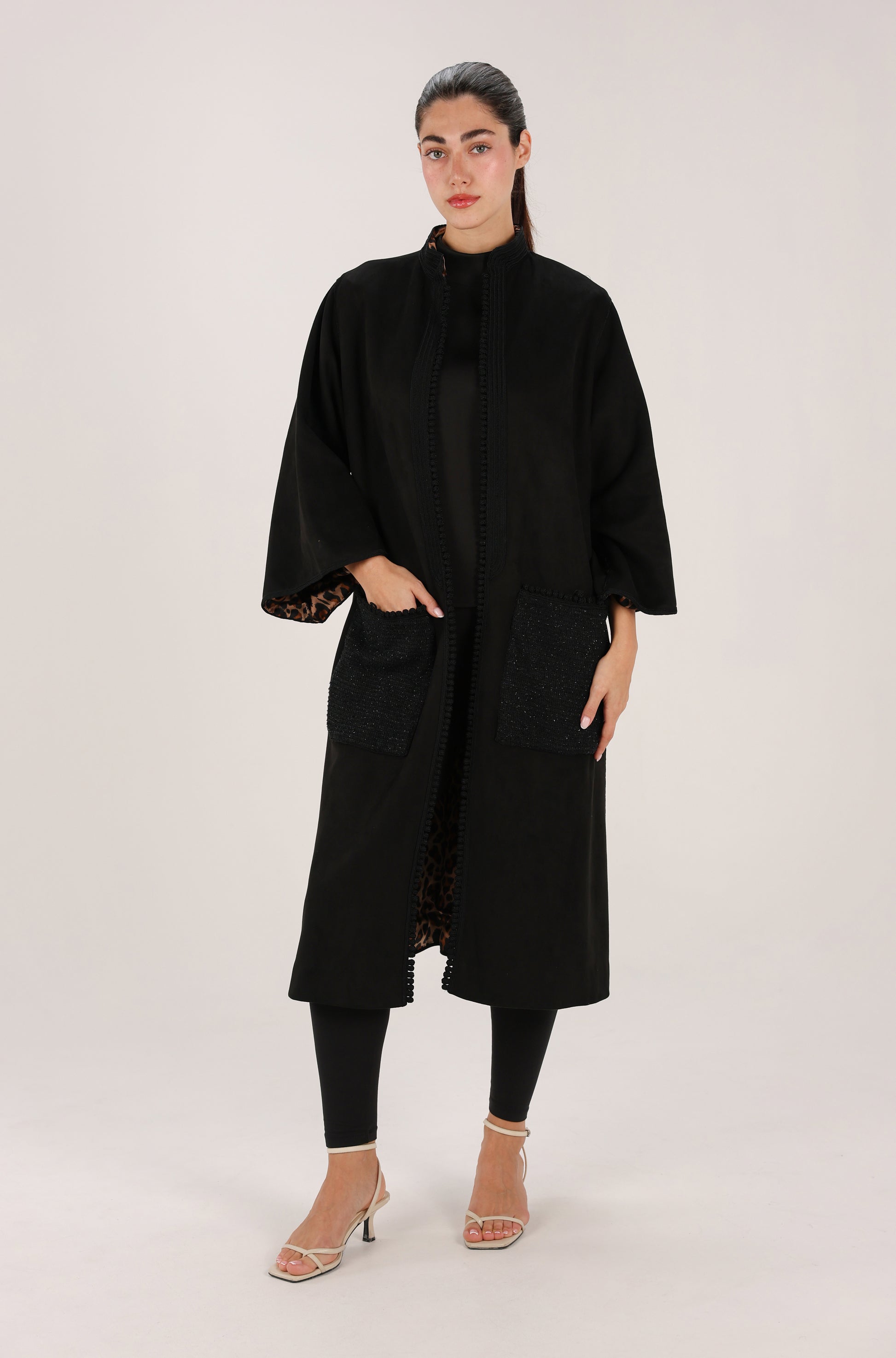Design details: Refined Moroccan embroidery with a bold leopard-print inner lining