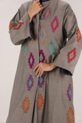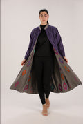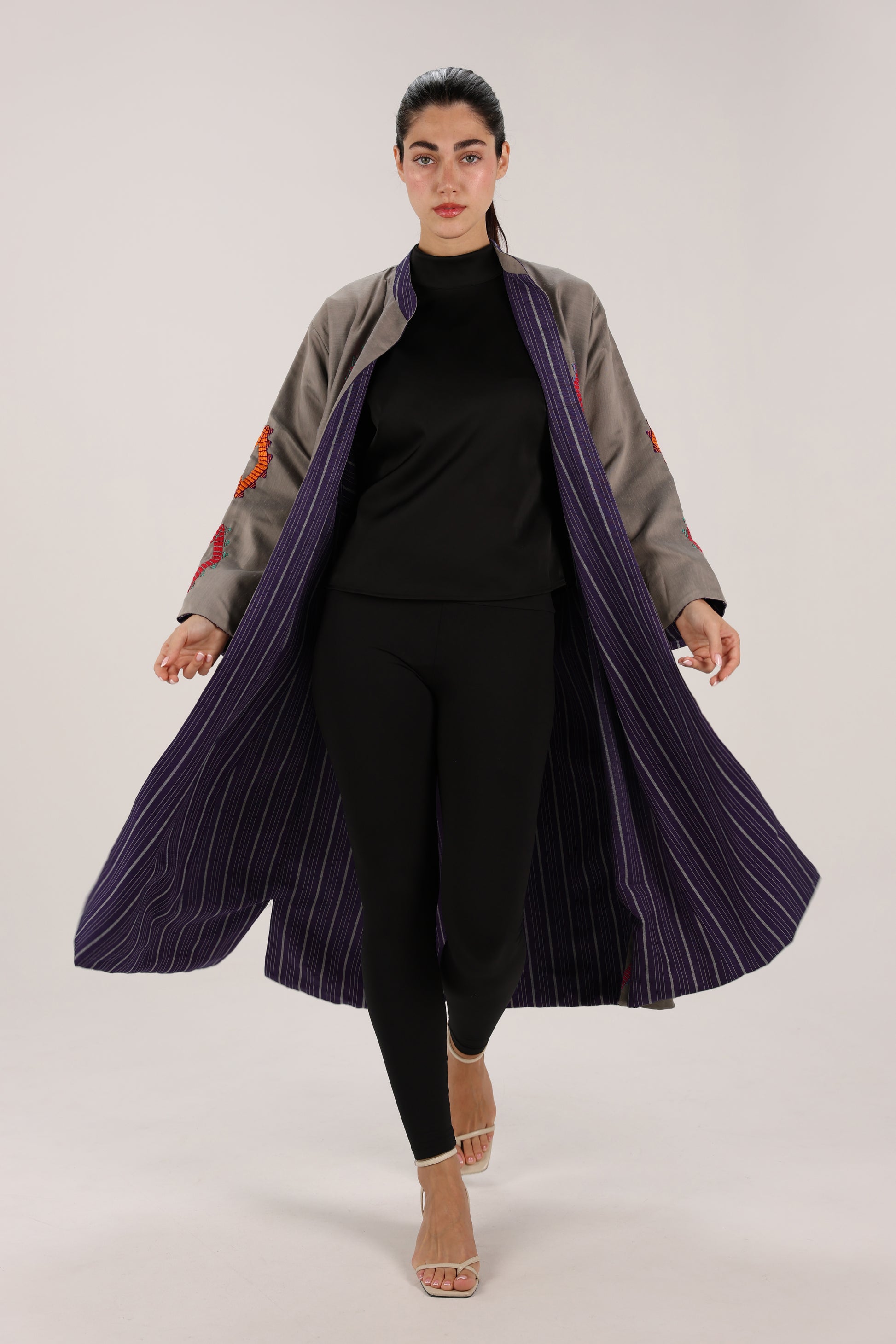 Colour: Taupe grey with multicolour embroidery / Reversible plum lining