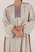 The Silver Mirage – Gray Jalabia is designed for effortless elegance and everyday comfort. Crafted in a soft printed fabric, this piece features subtle detailing at the neckline and gentle gathering through the sleeves, creating a relaxed yet refined silhouette.