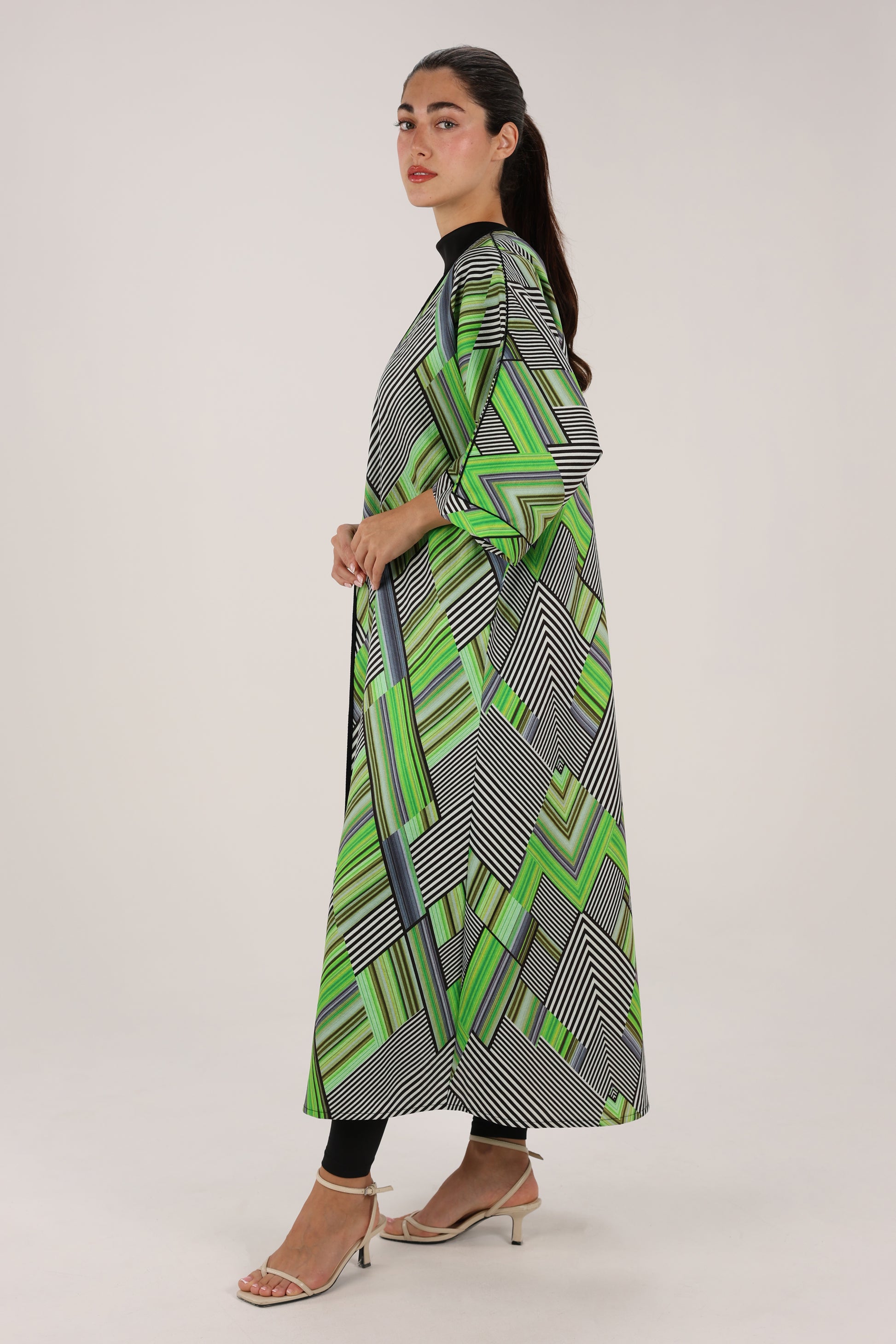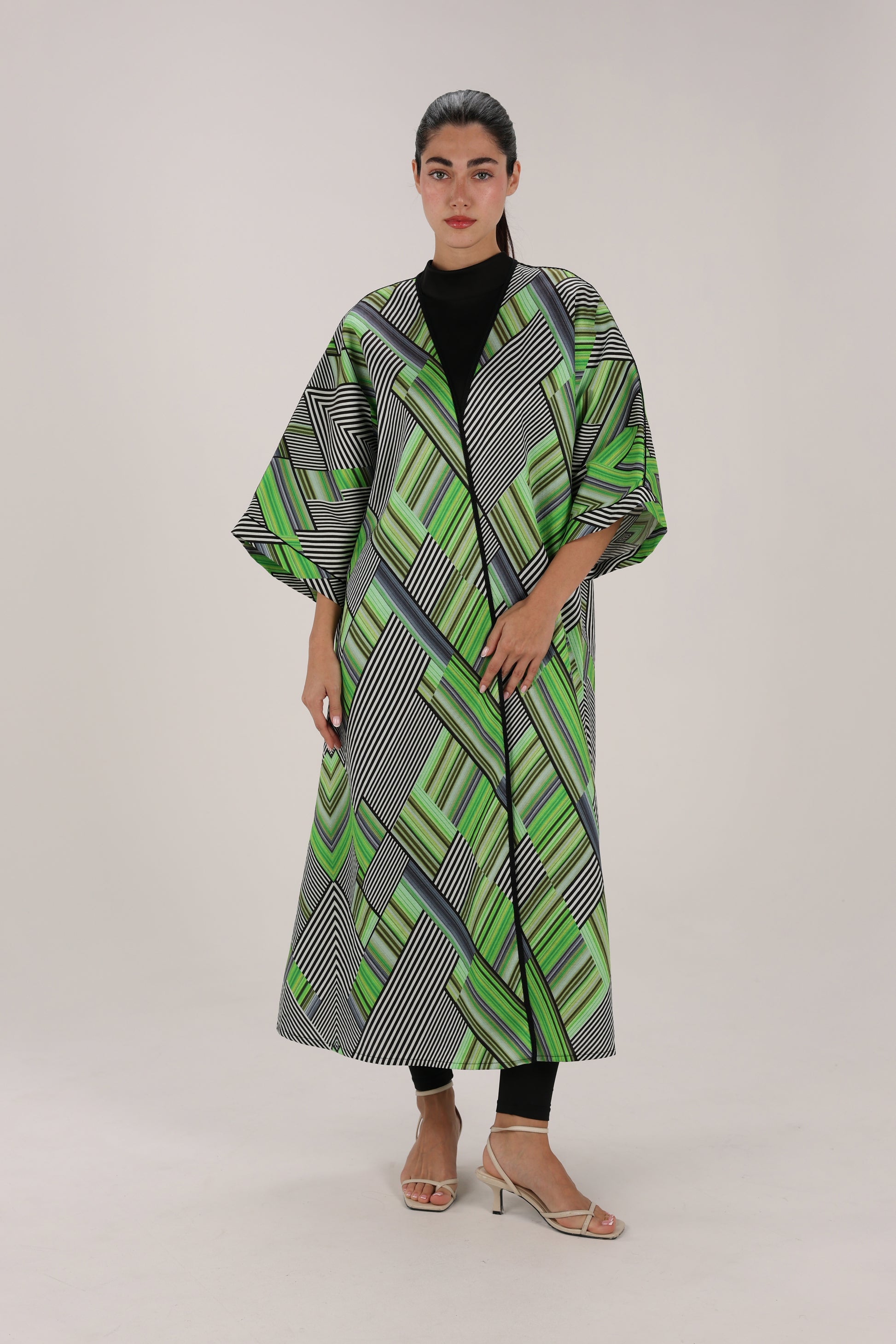 A striking open-front kaftan jacket that blends bold Moroccan geometry with effortless modern styling.