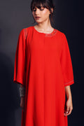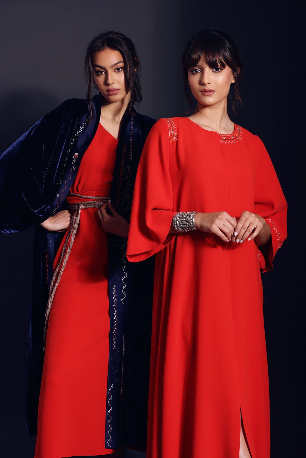Zina kaftan is hand embroidered with pure cotton and silk threads and beaded with high quality pearls representing the Jebliya (the symbol of the brand) in an abstract landscape.